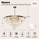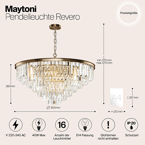 Арматура из металла в трех оттенках: латунь, хром, золото. Многоярусный декор. Подвески: прозрачное (арматура – хром, латунь) и янтарное (арматура – золото) стекло. Высота подвесных моделей регулируется.