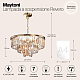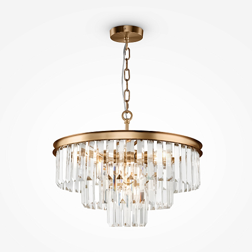 Арматура из металла в трех оттенках: латунь, хром, золото. Многоярусный декор. Подвески: прозрачное (арматура – хром, латунь) и янтарное (арматура – золото) стекло. Высота подвесных моделей регулируется.