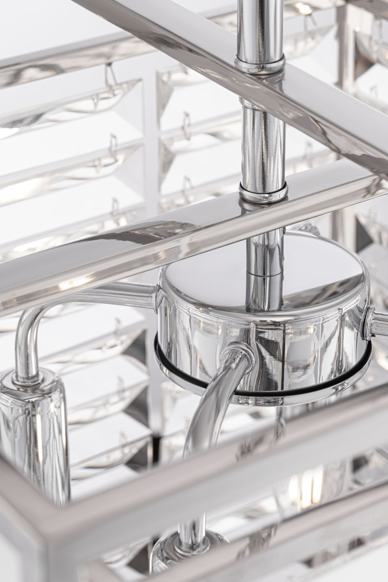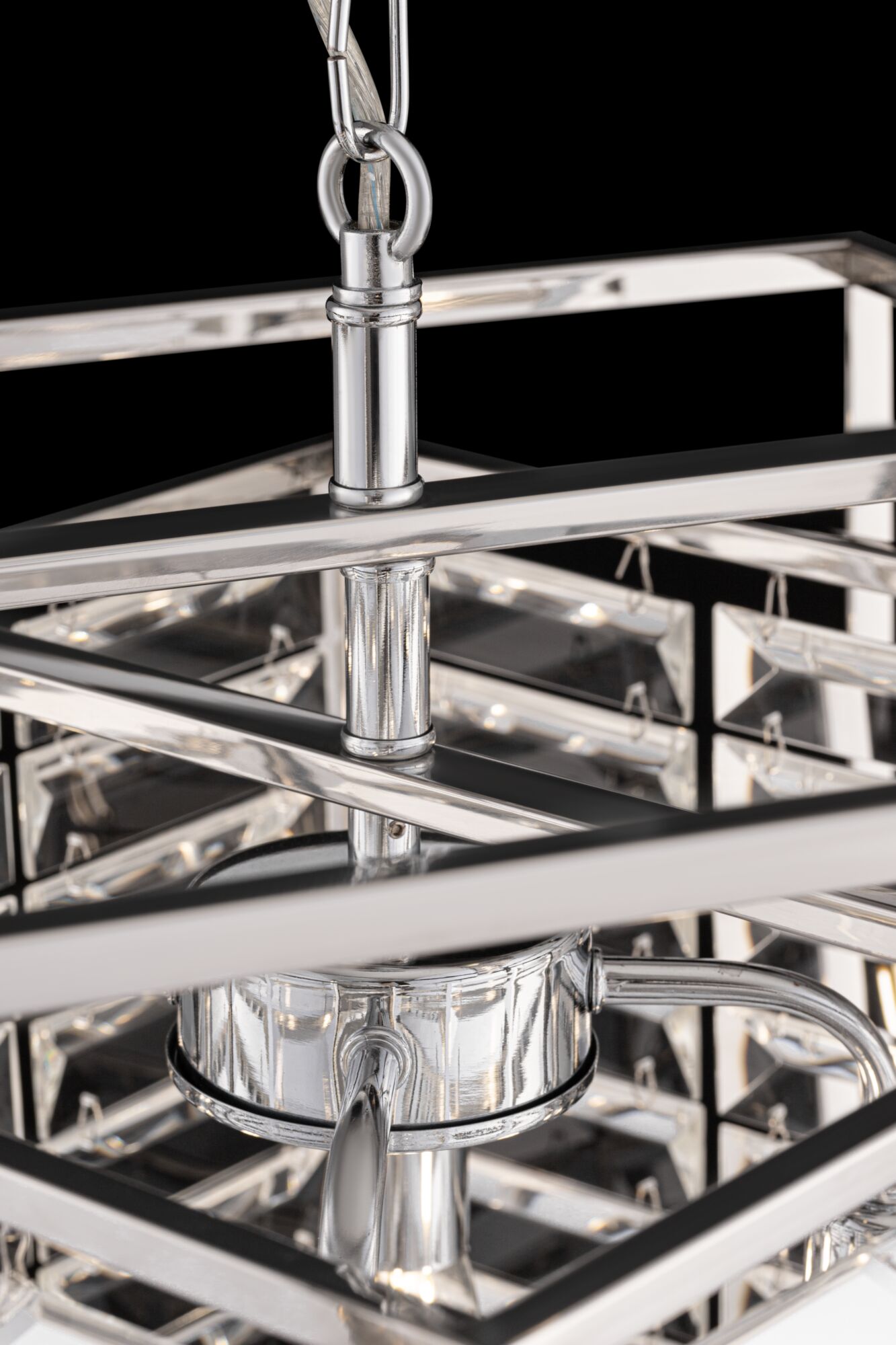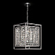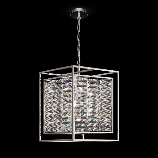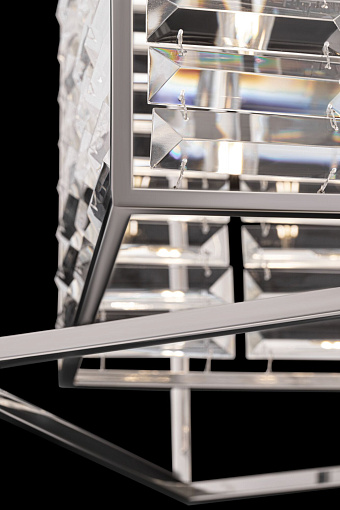 Арматура – металл, оттенки – хром, золото. Двойной геометрический плафон. Металлический каркас плафона окрашен в тон арматуре. Декор – стеклянные кри сталлы с трапециевидной огранкой. Высота подвесных моделей регулируется.