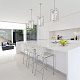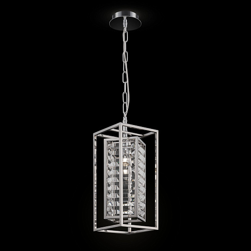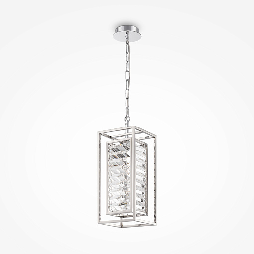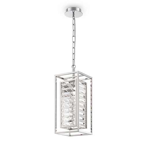 Арматура – металл, оттенки – хром, золото. Двойной геометрический плафон. Металлический каркас плафона окрашен в тон арматуре. Декор – стеклянные кри сталлы с трапециевидной огранкой. Высота подвесных моделей регулируется.