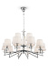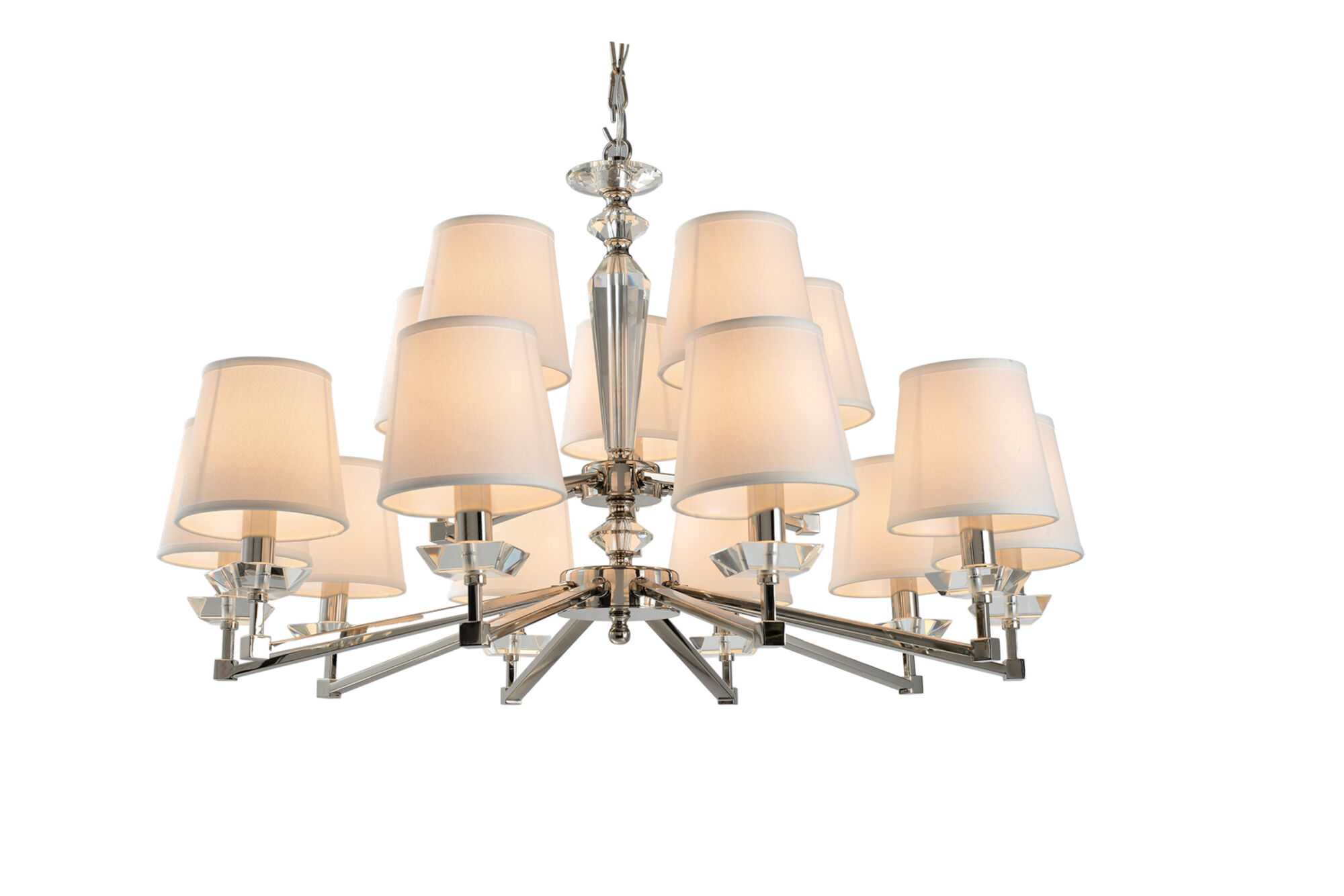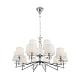 Металлическая арматура с гальваническим покрытием цвета никель. Абажуры из льна, нанесенного на ПВХ. Цвет абажуров – белый. Декор центральной части и рожков – прозрачное стекло. Высота люстр регулируется.