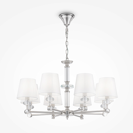 Материал арматуры – нержавеющая сталь, цвет – хром. Материал абажуров – текстиль на ПВХ, цвет – белый. Декор – прозрачное стекло. Акцентные стеклянные кристаллы на рожках со сложной огранкой.