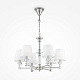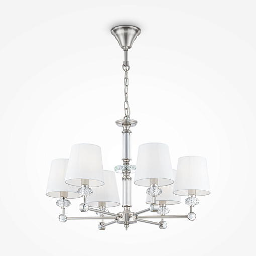 Материал арматуры – нержавеющая сталь, цвет – хром. Материал абажуров – текстиль на ПВХ, цвет – белый. Декор – прозрачное стекло. Акцентные стеклянные кристаллы на рожках со сложной огранкой.