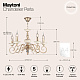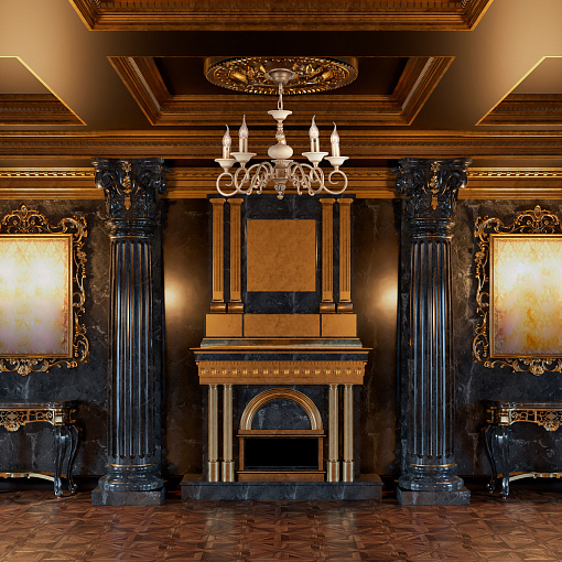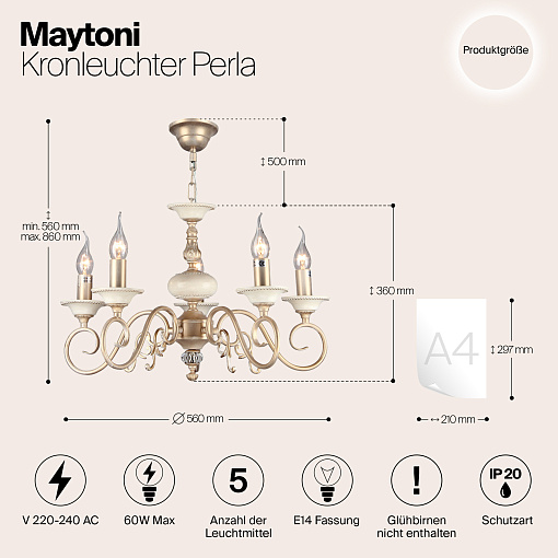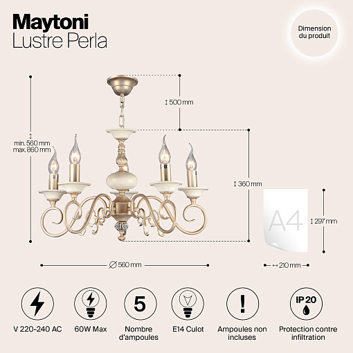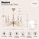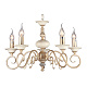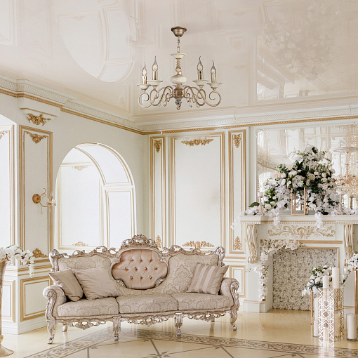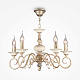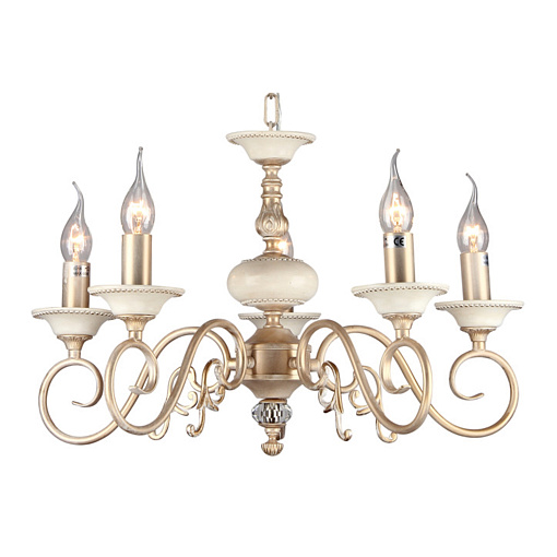 Металлическая арматура, цвет – золото с кремовыми вставками. Декоративные рожки с флористическими элементами. Источники света в форме свечей. Высота люстр регулируется длиной цепи.