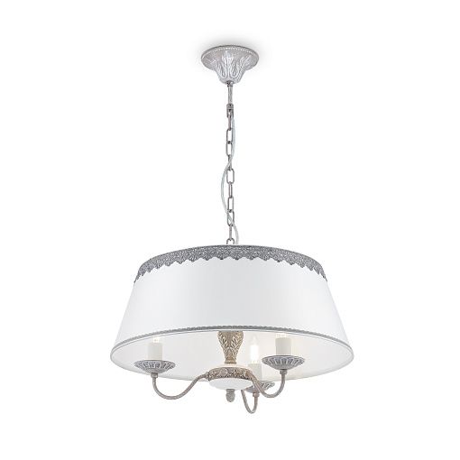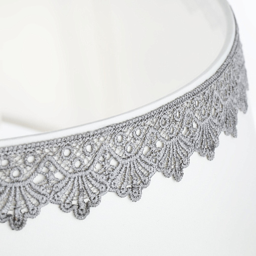 Арматура из металла в сером цвете, имитация естественных потертостей. Белые абажуры из хлопка на ПВХ. Кружевная окантовка. Декоративные элементы: рама для фото  у настольной лампы:, фигурки птиц. Регулируемая высота подвесных светильников. Источник света - лампа с цоколем Е14. У торшера - Е27.