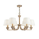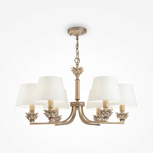 Материал арматуры – металл, цвет – античное золото. Материал абажуров – тек- стиль, нанесенный на ПВХ, оттенок – белый. Флористический декор – штампованный металл. Регулируемая высота подвесного светильника.