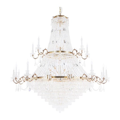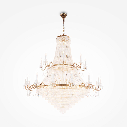 Арматура из металла, цвет – античное золото. Декор металлических элементов – инкрустированный цветочный орнамент. Многоярусные хрустальные подвески скрывают лампы. Часть моделей имеет открытые источники света в виде свечей.