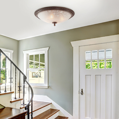 Металлическая арматура, оттенки – античная бронза, белый с золотом. Плафон – матовое стекло, пескоструйный рисунок. Обод и наконечник с прессованным орнаментом.