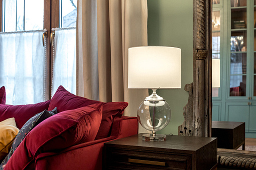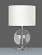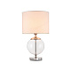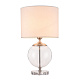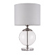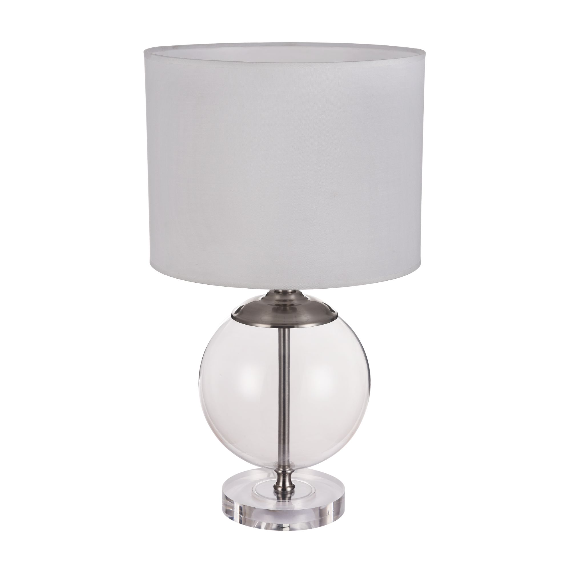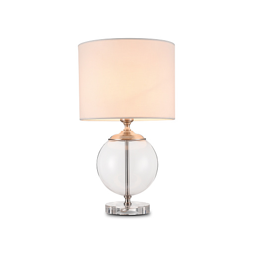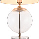 Материал арматуры – металл, цвет – никель. Абажур – кремовый текстиль на ПВХ. Основание – прозрачный акрил. Декор – шар из выдувного стекла.