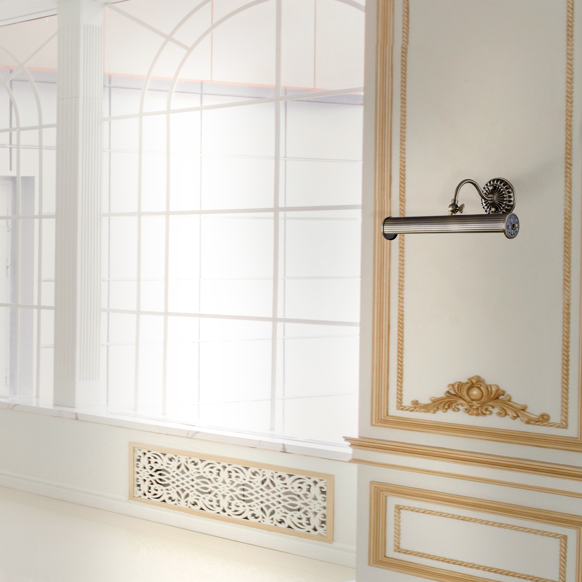 Серия светильников для подсветки картин с ребристым корпусом и круглым основанием в виде классической розетки. Благодаря многообразию цветов можно без труда подобрать светильник, удовлетворяющий требованиям освещаемого интерьера. Угол наклона подсветки регулируется механическим шарниром, установленным на кронштейне.