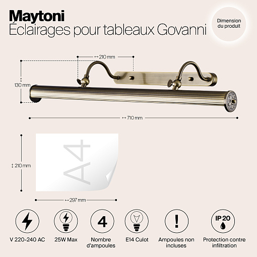 Отличительной чертой светильников для подсветки картин из серии Govanni является их длина, составляющая более 700 мм. Благодаря разнообразию цветов можно без труда подобрать светильник, удовлетворяющий требованиям освещаемого интерьера. Угол наклона подсветки регулируется механическим шарнирами, установленными на оба кронштейна.