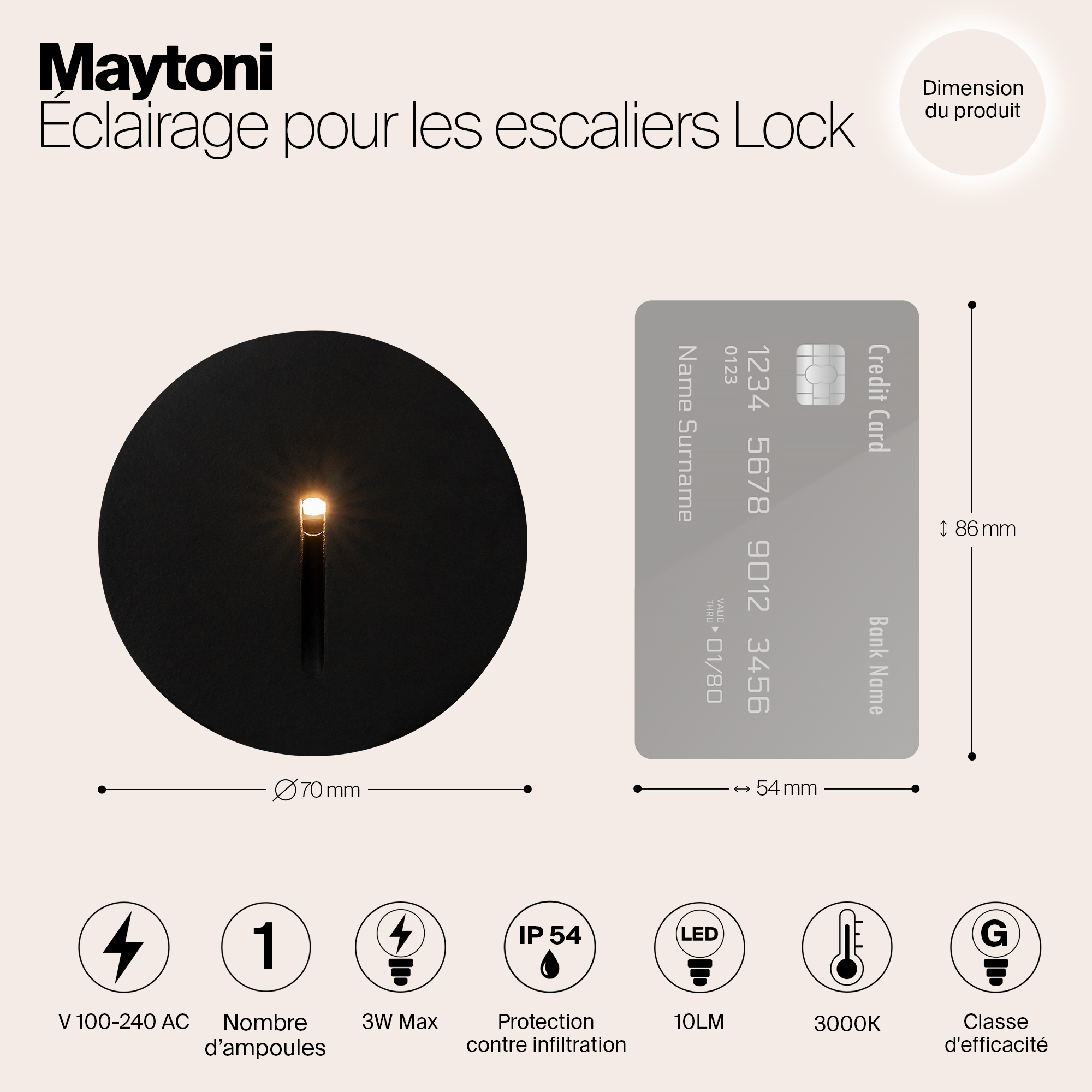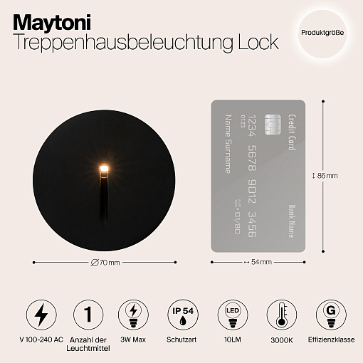 Материал корпуса — алюминий. Оттенки — черный, белый. LED-источник света, цветовая температура — 3000К. Индекс цветопередачи — 80Ra. Угол рассеивания — 30°. Высокая степень защиты —IP 54.