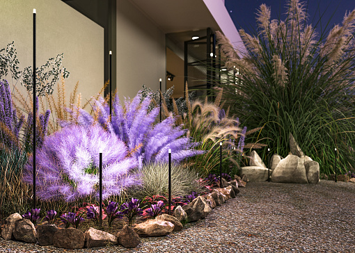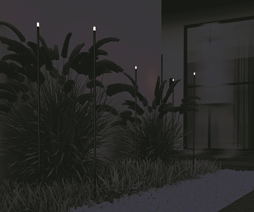 Металлический корпус, цвет - графит. Белый акриловый рассеиватель. Узкий цилиндрический светильник для подсветки растительных насаждений - цветов, кустарников, деревьев, газонов. Установка в грунт. Возможность подключения нескольких светильников к одному источнику питания. LED-источник света, цветовая температура - 3000К. Степень защиты - IP65. Питание 24В.