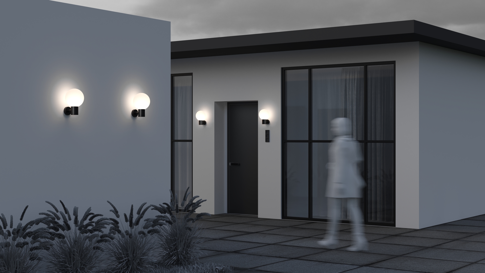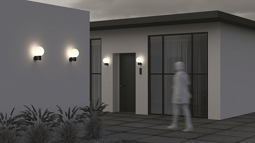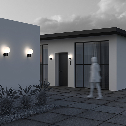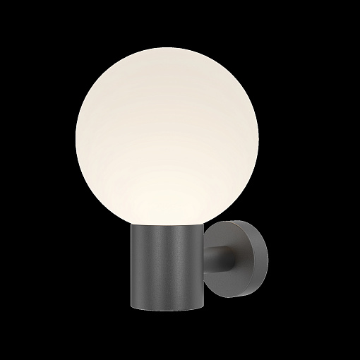 Алюминиевый корпус. Оттенки - черный, серый. Сферические плафоны из белого матового стекла. Защита от коррозии и перападов температур. Высокая степень защиты — IP 54. Источник света — лампа с цоколем E27.