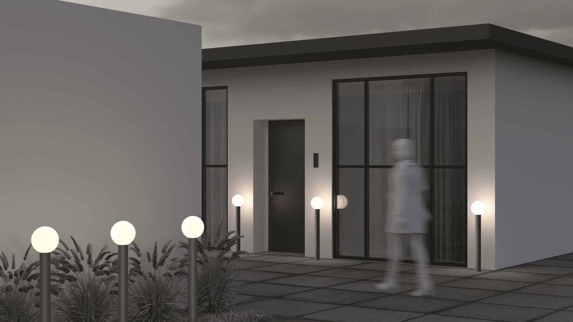 Алюминиевый корпус. Оттенки - черный, серый. Сферические плафоны из белого матового стекла. Защита от коррозии и перападов температур. Высокая степень защиты — IP 54. Источник света — лампа с цоколем E27.