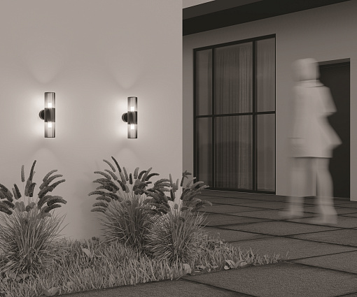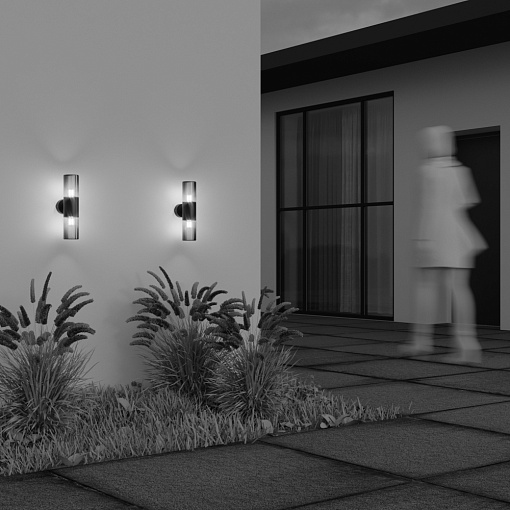 Алюминиевый корпус, цвет - графит. Световой элемент - тонированное стекло. Источник света - лампа с цоколем Е27.  Универсальная серия для современных и классических экстерьеров. Защита IP54.