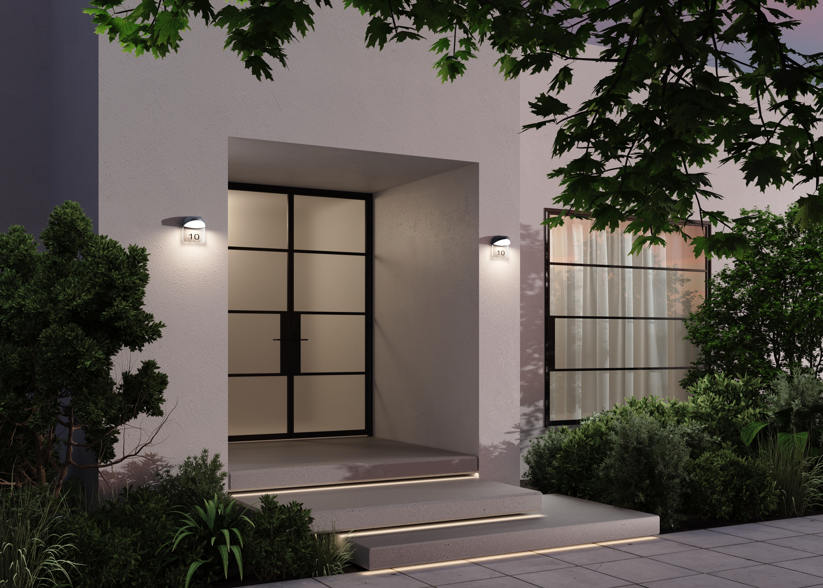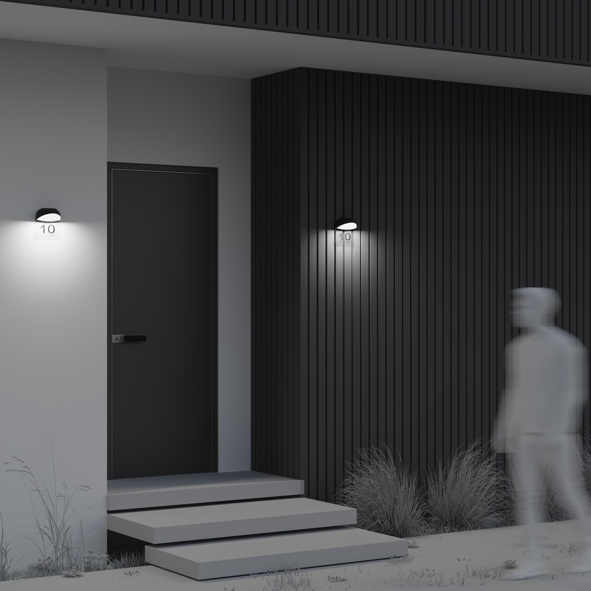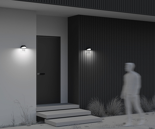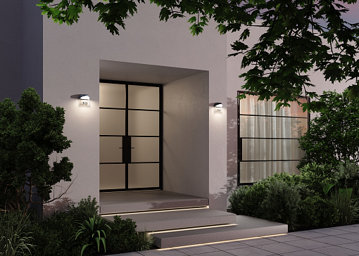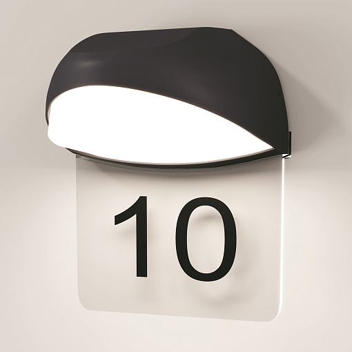 Алюминиевый корпус, цвет - графит. Рассеиватель из белого матового акрила. В комплекте - табличка  из прозрачного пластика для нанесения обозначений (номера дома и др.).  LED-источник света, цветовая температура 3000К. Степень защиты IP54.