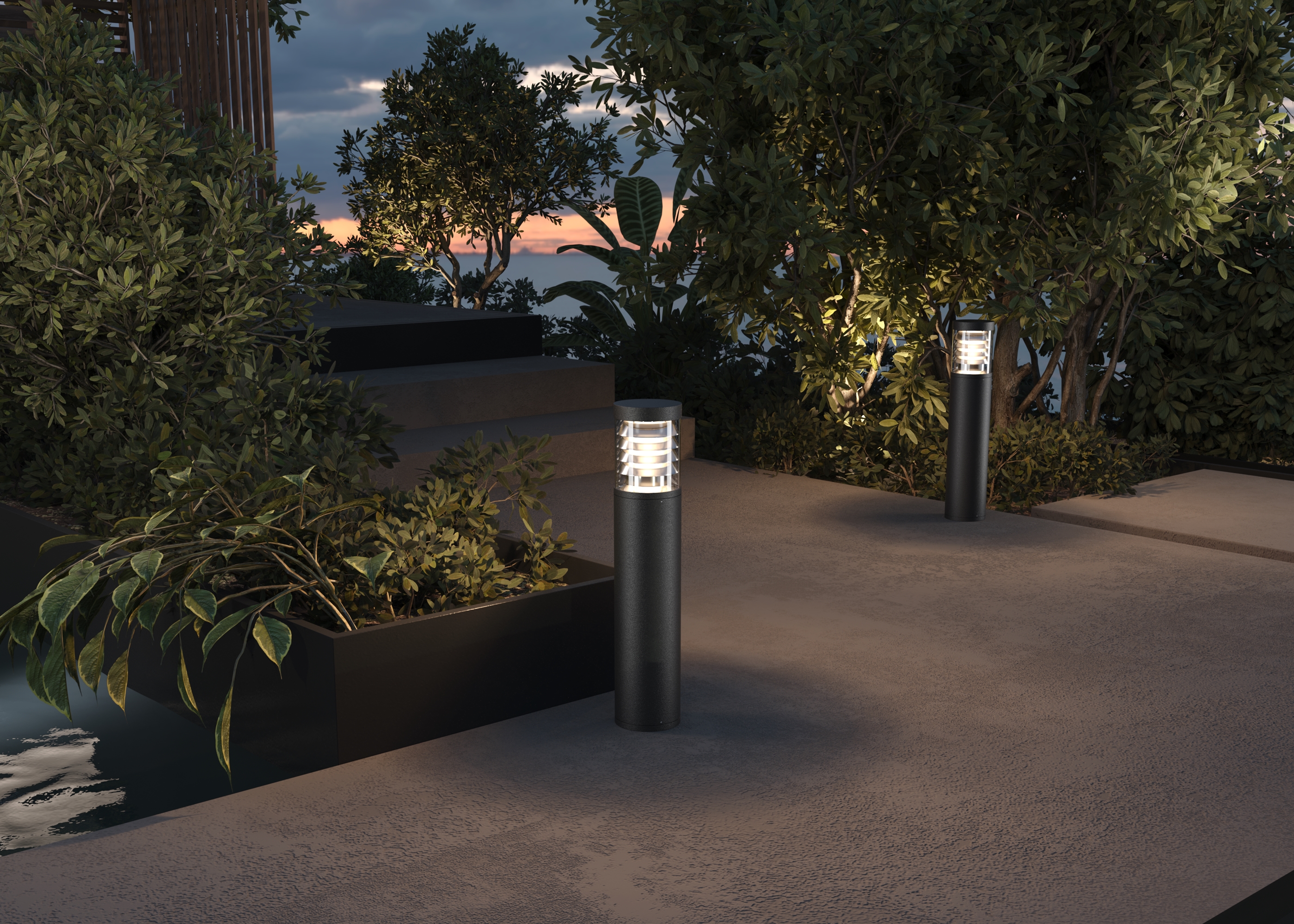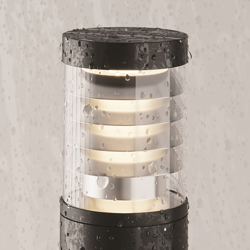 Алюминиевый корпус, цвет - графит.  Многослойный каскадный рассеиватель серебристого цвета скрывает LED-источник света, предотвращая эффект слепимости и мягко рассеивает свет. Цветовая температура - 3000К. Степень защиты - IP54.