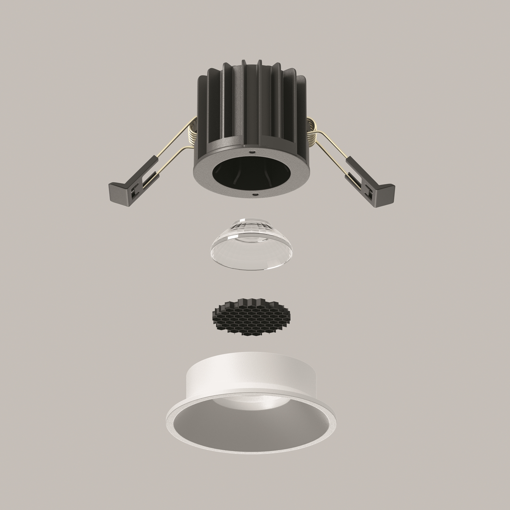 Материал корпуса – металл; цвет – белый, чёрный и латунь. Два варианта корпуса: встраиваемые светильники с узкой рамкой и встраиваемые светильники без видимой рамки, предназначенные для безрамочного монтажа под шпаклёвку. Широкий угол рассеивания 60°. Утопленный LED-источник света мощностью 7 или 12Вт. Высокий коэффициент цветопередачи. Цветовая температура 3000К или 4000К. Наличие биодинамических моделей и дополнительных антибликовых фильтров.