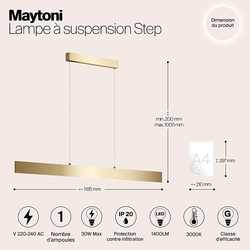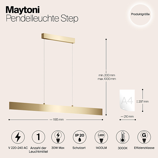 Серия стильных подвесных светильников золотого  цвета в современном стиле. Модели Step обеспечивают сбалансированную направленную и отраженную подсветку. В качестве источников света используются SMD-светодиоды, установленные в алюминиевом корпусе и закрытые опаловым рассеивателем; такое решение обеспечивает максимально комфортное мягкое освещение. Широкий выбор параметров светильников позволит с легкостью интегрировать их в различные проекты.