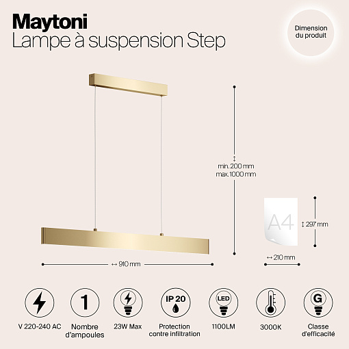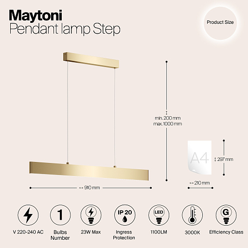 Серия стильных подвесных светильников золотого  цвета в современном стиле. Модели Step обеспечивают сбалансированную направленную и отраженную подсветку. В качестве источников света используются SMD-светодиоды, установленные в алюминиевом корпусе и закрытые опаловым рассеивателем; такое решение обеспечивает максимально комфортное мягкое освещение. Широкий выбор параметров светильников позволит с легкостью интегрировать их в различные проекты.