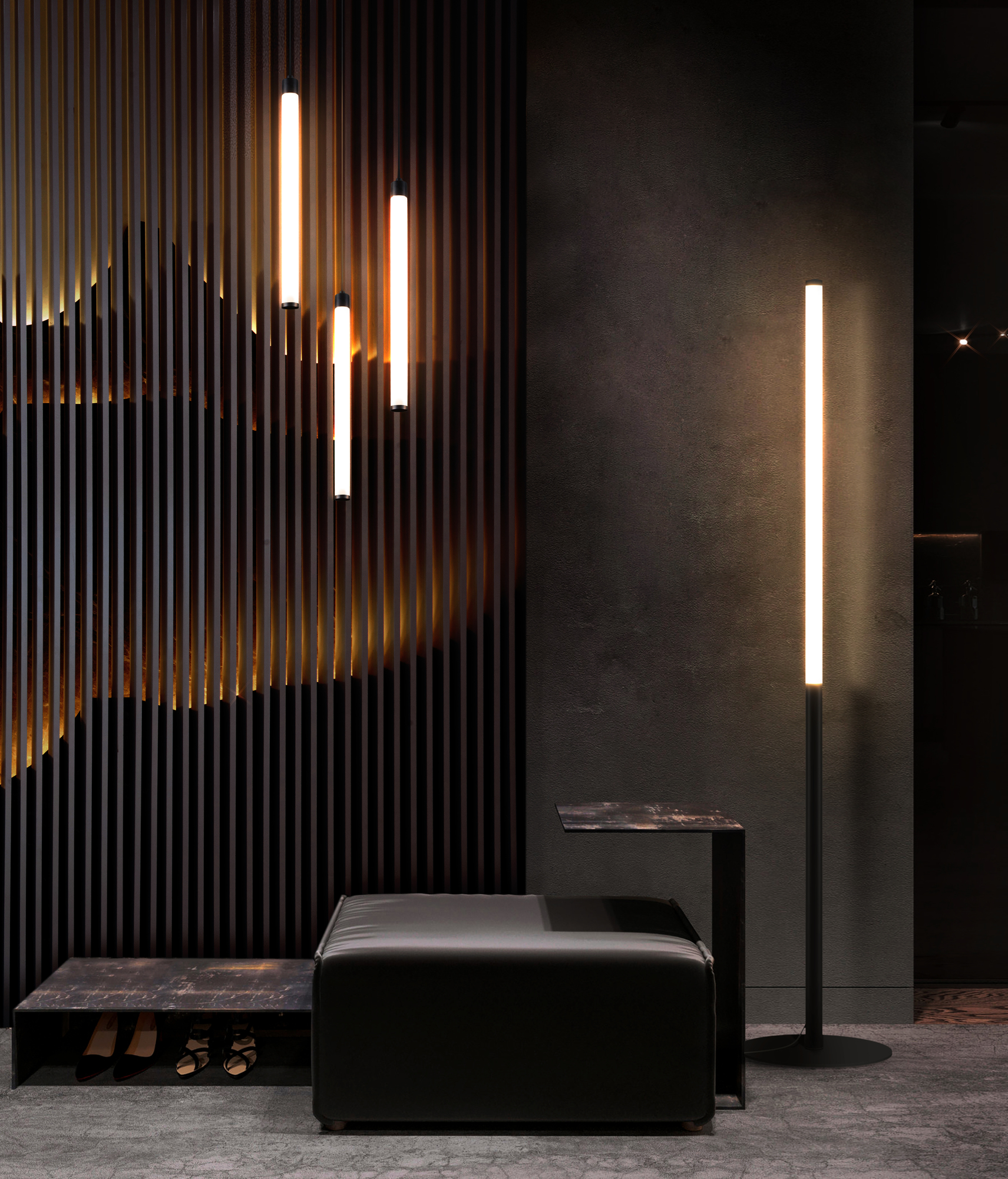Едва уловимый взглядом светильник серии Ray буквально пронизывает пространство светом. Под корпусом из металла и акрила скрываются мощные SMD-светодиоды. Арматура выполнена из алюминия. Светильники окрашены в черный, белый и цвет матового золота. Тонкий провод добавляет конструкции легкости и регулируется по длине, позволяя расположить светильник на нужной высоте. Разная длина корпусов позволит составить индивидуальную композицию для украшения интерьера.