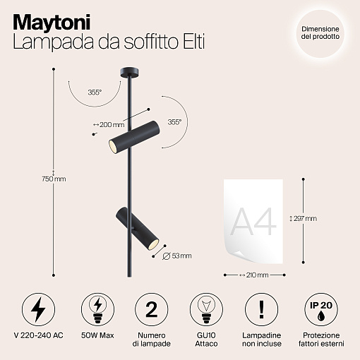 Потолочные накладные светильники на один и два плафона. Лампы устанавливаются в плафонах-цилиндрах, закрепленных на вертикальной планке. Конструкция обеспечивает гибкую регулировку светового потока на 360° в горизонтальной плоскости и на 180° в вертикальной. Светильники рекомендуется использовать с лампами Voltega (art. 7060/7061) мощностью 7W и углом рассеивания 38°. Диммируемые версии ламп — art. 7108/7109. Серия представлена в трех актуальных оттенках: черный, белый и трендовое матовое золото.