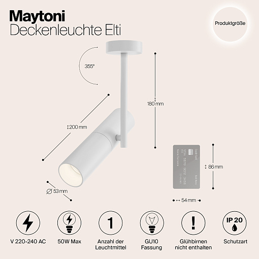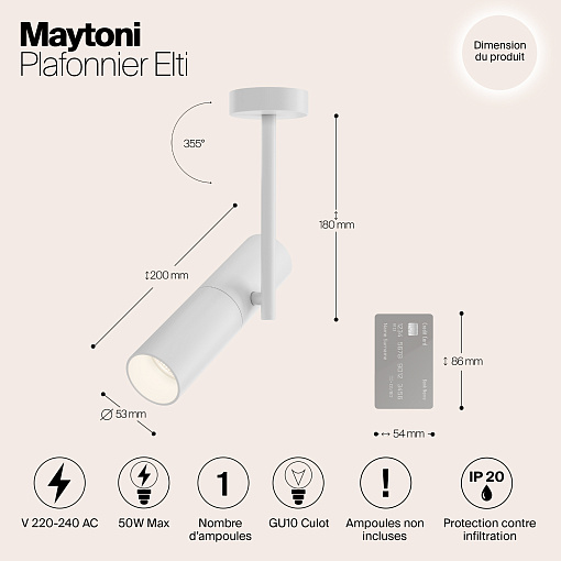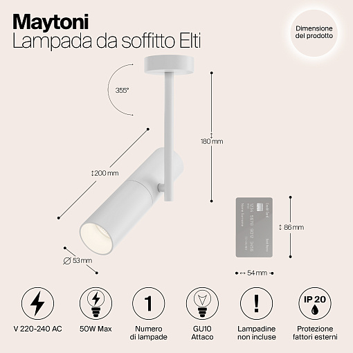 Потолочные накладные светильники на один и два плафона. Лампы устанавливаются в плафонах-цилиндрах, закрепленных на вертикальной планке. Конструкция обеспечивает гибкую регулировку светового потока на 360° в горизонтальной плоскости и на 180° в вертикальной. Светильники рекомендуется использовать с лампами Voltega (art. 7060/7061) мощностью 7W и углом рассеивания 38°. Диммируемые версии ламп — art. 7108/7109. Серия представлена в трех актуальных оттенках: черный, белый и трендовое матовое золото.