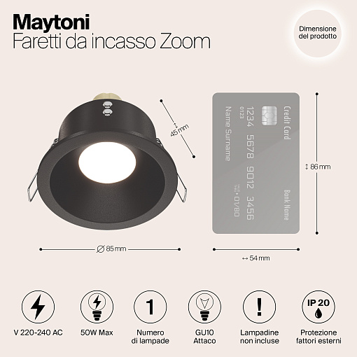 Защитное прозрачное стекло и силиконовые уплотнители обеспечивают высокую степень защиты IP65, что позволяет использовать светильники во влажных помещениях. Для визуального комфорта интегрированный LED-модуль углублен в корпус, также в серии представлены модели с цоколем под лампу GU10. Светильники сделаны из литого алюминия. При окрашивании используется стойкая к царапинам порошковая краска. Серия представлена моделями разной мощности, формой рамки, в черном и белом цвете.